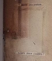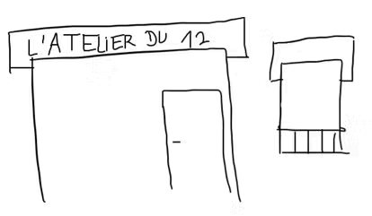L’Atelier du 12, c’est une ancienne boutique, entre un restaurant et un fleuriste. On nous a raconté que c’était un loueur de voitures, avant. Encore avant, une boutique de cartes postales. Les murs ont révélé au moment des travaux, sous des couches de peinture et de placoplâtre, les traces d’un salon de coiffure – sans doute il y a longtemps, au moment de la construction de l’immeuble.